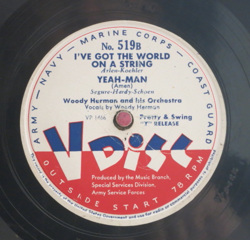 V-Disc was a record label founded during World War II through a special agreement between the US government and various private US record companies. Many well-known Schager singers, swing big bands and dance music orchestras of the time recorded special V-Disc records. These 12-inch 78 rpm records (material: vinyl or shellac) were created between 1943 and 1949. The “V” stands for “Victory”.