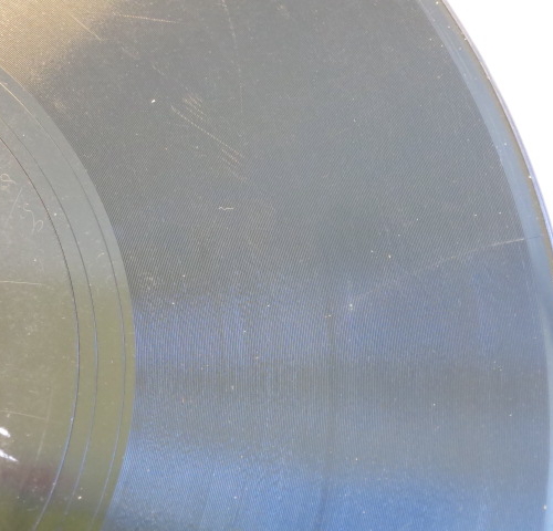 Schellackplatte ist leicht oberflächlich angerissen. Klopft man jedoch mit dem Fingerknöchel leicht an die Platte, ist KEIN VIBRIEREN  zu hören. Die Schellackplatte ist also nich durchgerissen.