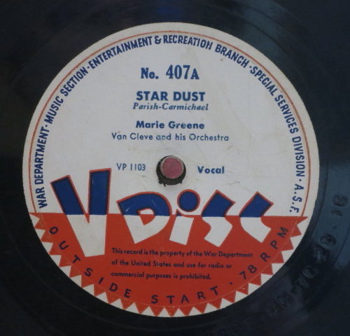 V-Disc was a record label founded during World War II through a special agreement between the US government and various private US record companies. Many well-known Schager singers, swing big bands and dance music orchestras of the time recorded special V-Disc records. These 12-inch 78 rpm records (material: vinyl or shellac) were created between 1943 and 1949. The “V” stands for “Victory”.