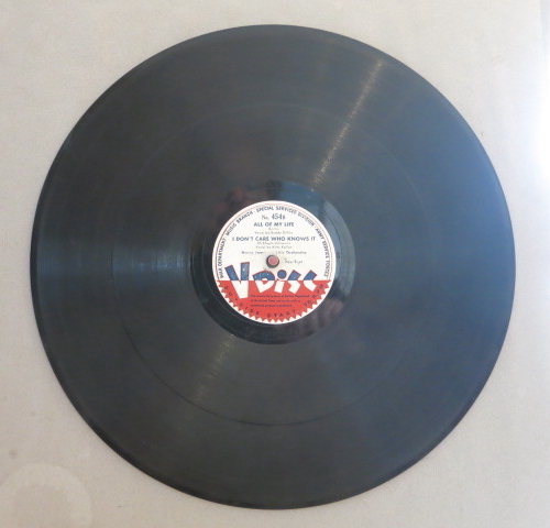 V-Disc was a record label founded during World War II through a special agreement between the US government and various private US record companies. Many well-known Schager singers, swing big bands and dance music orchestras of the time recorded special V-Disc records. These 12-inch 78 rpm records (material: vinyl or shellac) were created between 1943 and 1949. The “V” stands for “Victory”.